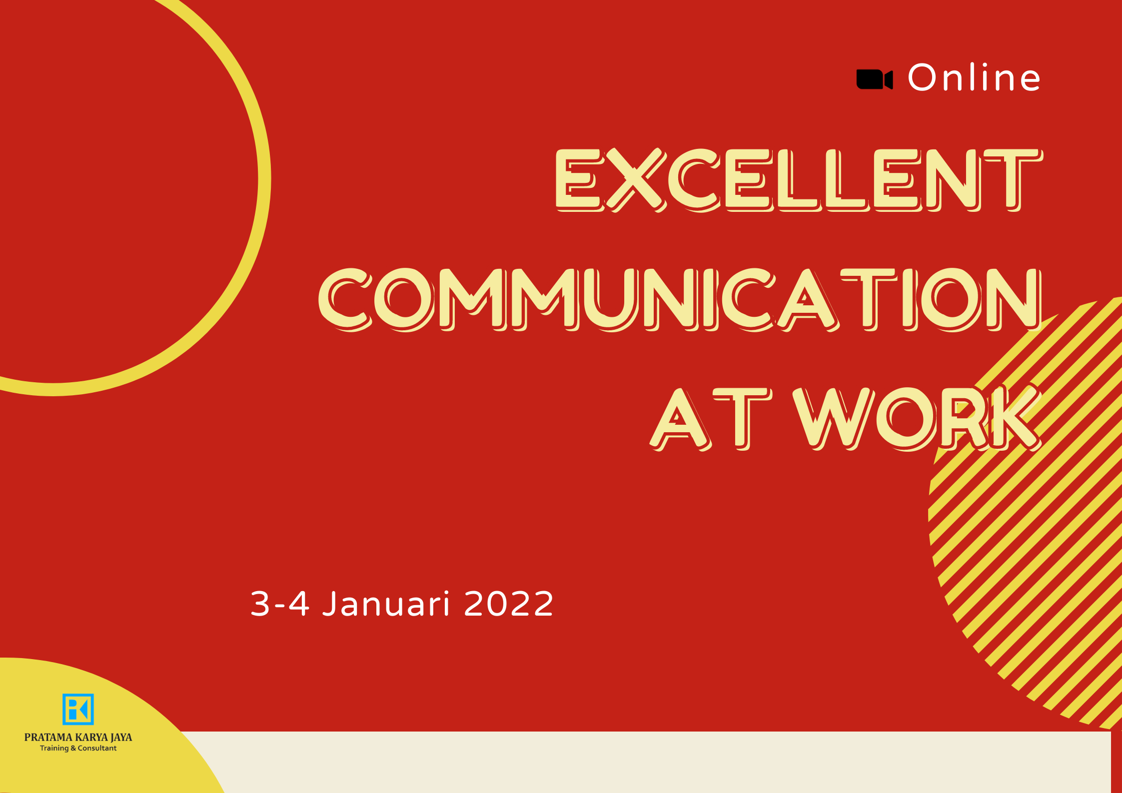 EXCELLENT COMMUNICATION AT WORK adalah sebuah pelatihan unik yang memampukan peserta untuk mengenali dan memahami karakteristik diri sendiri dan orang lain dan membangun hubungan kerja yang lebih efektif dan produktif. Pelatihan ini juga dapat meningkatkan keterampilan mendengarkan termasuk memahami informasi yang diberikan serta mencari solusi. Inilah pelatihan yang akan mengubah peserta menjadi seorang komunikator yang efektif. Komunikasi yang efektif adalah komunikasi di mana pesan dari pembicara dipahami oleh pendengar sesuai dengan yang dimaksud oleh pembicaranya. Tanpa komunikasi yang efektif, maka akan sering terjadi kesalahpahaman di antara dua individe, atasan, dan bawahan., dalam suatu grup yang menyebabkan hal-hal yang tidak dikehendaki seperi pertikaian, kehilangan sales, problem produksi, dan hal negatif lainnya. Tanpa adanya kemampuan untuk berkomunikasi yang efektif juga akan mengakibatkan ketidaknyamanan bekerja, gagalnya instruksi diimplementasi, kinerja buruk buruk, iri hati, low morale, dan lain-lain .