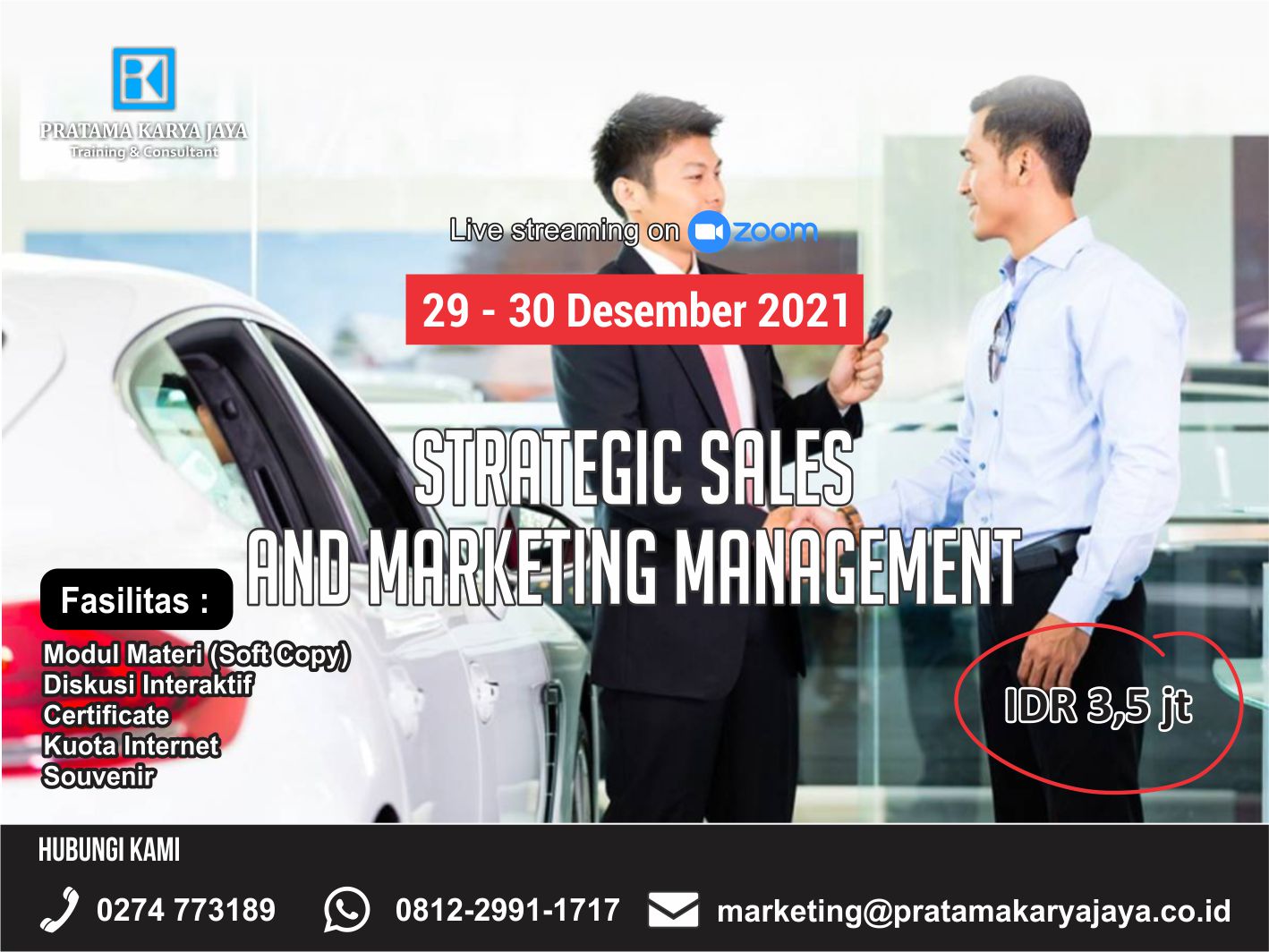 Strategi Sales dan Pemasaran adalah pedoman yang jelas dan praktis mengenai strategi-strategi yang paling efektif untuk menyusun sebuah rencana pemasaran dan penjualan. Khususnya di bagian Revenue di perlukan suatu keterampilan.Marketing yang tertintegrasi dari atasan sampai dengan team yang maju langsung berhadapan dengan pelanggan. Perbedaan strategi di tambah lagi dengan “Pelanggan Behaviour”. Target yang sangat menantang ditahun mendatang, membuat semua bagian dari organisasi harus berjuang untuk dapat mencapai tujuan yang telah di tetapkan bersama.