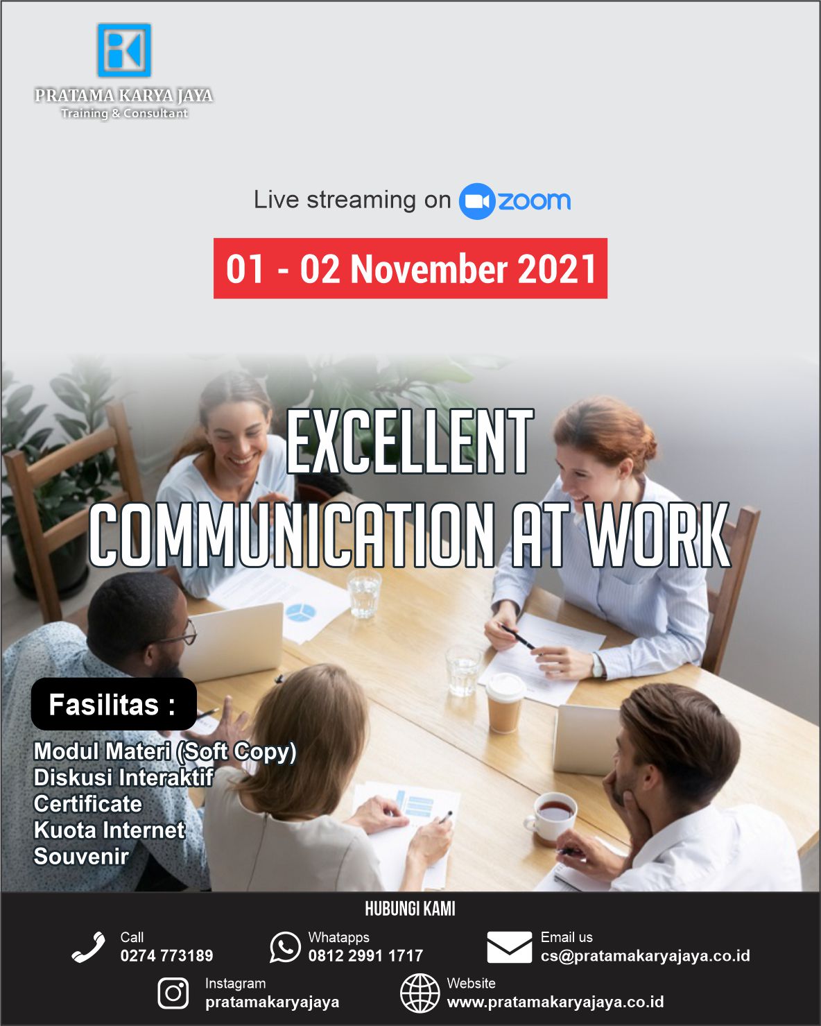 Pelatihan ini akan memberikan kemampuan untuk mendengar secara aktif, memberi feedback positif, serta memotivasi orang lain. Hal ini akan dapat meningkatkan semangat dan produktivitas kerja Di samping itu akan membekali peserta dengan kemampuan public speaking sehingga dapat mengekspresikan ide‐ide secara efektif dan tepat sasaran.